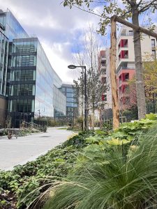 De 2020 à2023, la livraison de 46 667 m2 de bureaux s’est poursuivie. Fin 2023 : au bas des immeubles de bureaux, l’allée des Messagerie, égayée d’un passage dessinant un clavier de piano, permet désormais de joindre la rue de Bois-Colombes et la rue Raoul-Nordling.
